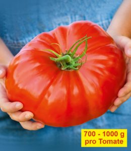 Wahrhaft gigantische Tomaten mit einem Gewicht von 700 bis 1000 Gramm liefert Ihnen die neue, veredelte Fleisch-Tomate Gigantomo F1. Somit ernten Sie die größten Tomaten der Welt! Eine Tomate reicht für eine 4-köpfige Familie. Und auch das fruchtig-süße Aroma der veredelte Fleisch-Tomate Gigantomo F1 (Lycopersicon esculentum) ist rekordverdächtig! Gesunde, robuste & ertragreiche Pflanzen.